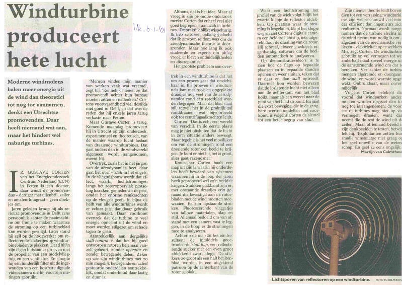 The fundamental equations about wind energy extraction date from the year 1915 when Lanchester published the basic momentum and energy balance for a device which extracts energy from wind. In most cases this theory is attributed to A. Betz who published the same in 1920. The theory proofs that a wind turbine maximally extracts 16/27 (=59%) of the energy from the flow. Corten re-analysed this theory and added the a wind turbine when extracting 16/27 of the energy from the flow, in fact has an inherent extra extraction of 8/27 which becomes heat. So according to Corten the extraction of kinetic energy from the flow is not 16/27, but 24/27.